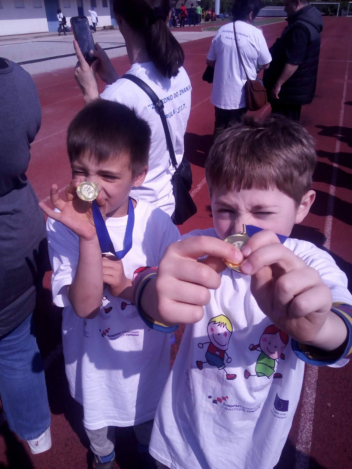 Predstavnici OŠ Veli Vrh Pula u disciplini 100m združeno (2x50m) bili su učenik 1.b razreda i učenica 6.b razreda sa svojim prijateljima, partnerima. Na tribinama su za njih i ostale natjecatelje navijali prijatelji iz razreda. Naši su učenici osvojili dva prva mjesta i zlatne medalje.