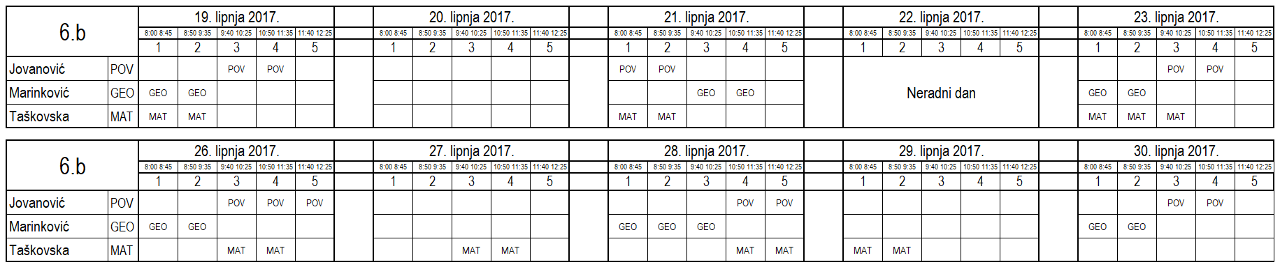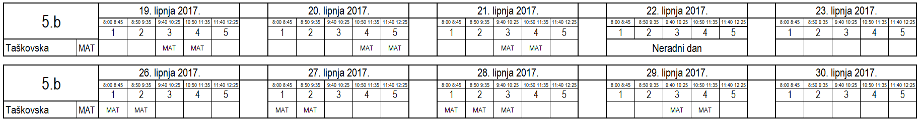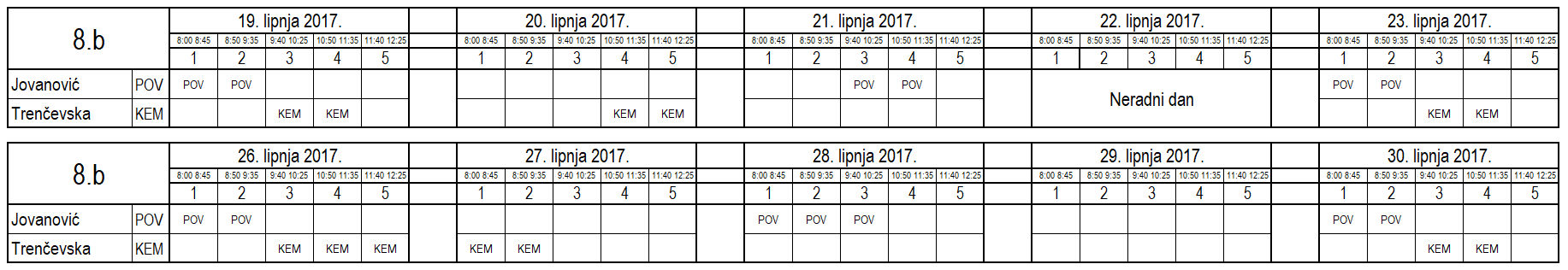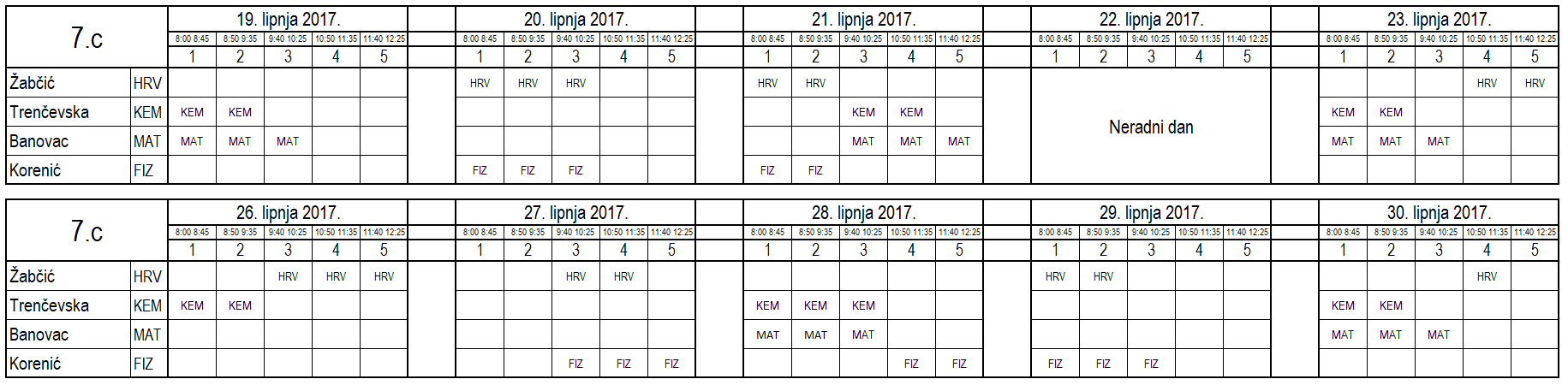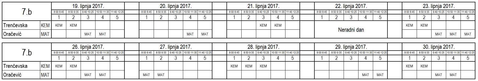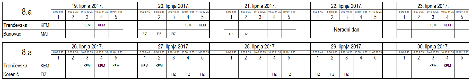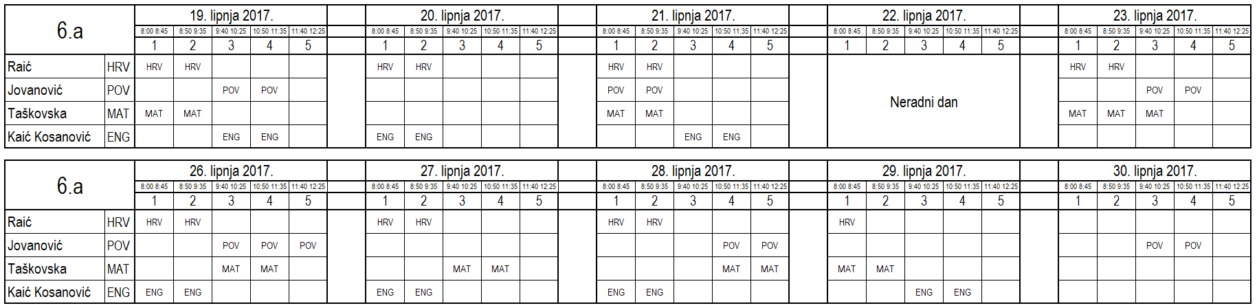 I ove godine neki učenici nisu uspjeli na vrijeme usvojiti predviđeno gradivo i za njih je organiziran dopunski rad. Raspored je sljedeći (klikom na tablicu dobije se povećani prikaz):