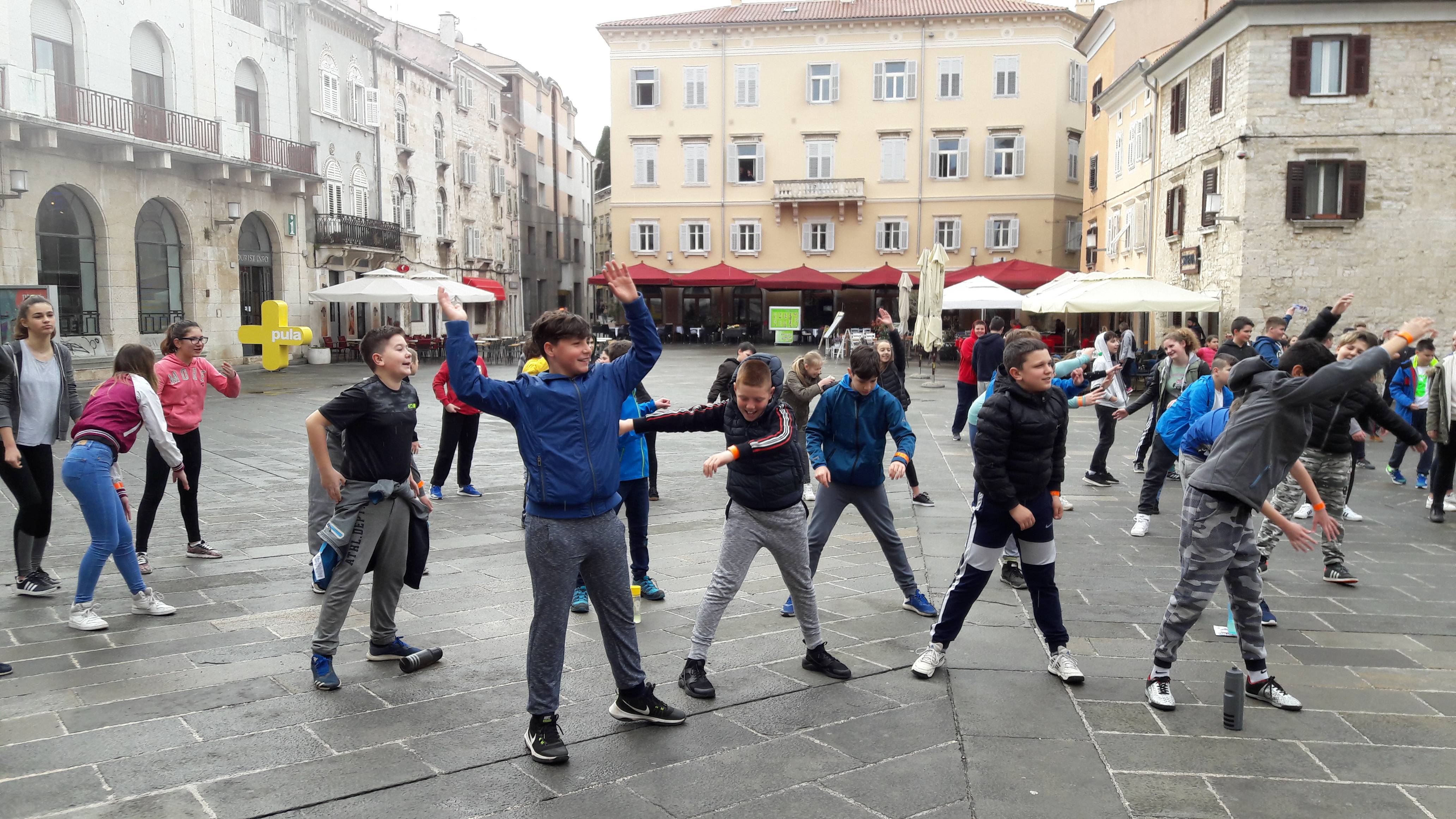 Naši učenici šestih razreda Gabriela Petrović, David Moguš, Sara Sirotić, Corina Milovan i Sven Lenđel (6.a), Luka Petrović, Franko Benčić, Diego Vlacci, Marco Delfar i Senur Avdija (6.b), Ivan Šimić, Ivan Chiavalon, Patrik Rebrović, Paolo Močenić i Antonio Jurak (6.c) u pratnji učiteljice Sanje Otočan doprinijeli su promociji zdravog načina života aktivnim vježbanjem. Razgibavanje je na Forumu vodio Erik Lukšić koje je zbog vremenskih neprilika trajalo nešto kraće od predviđenog.