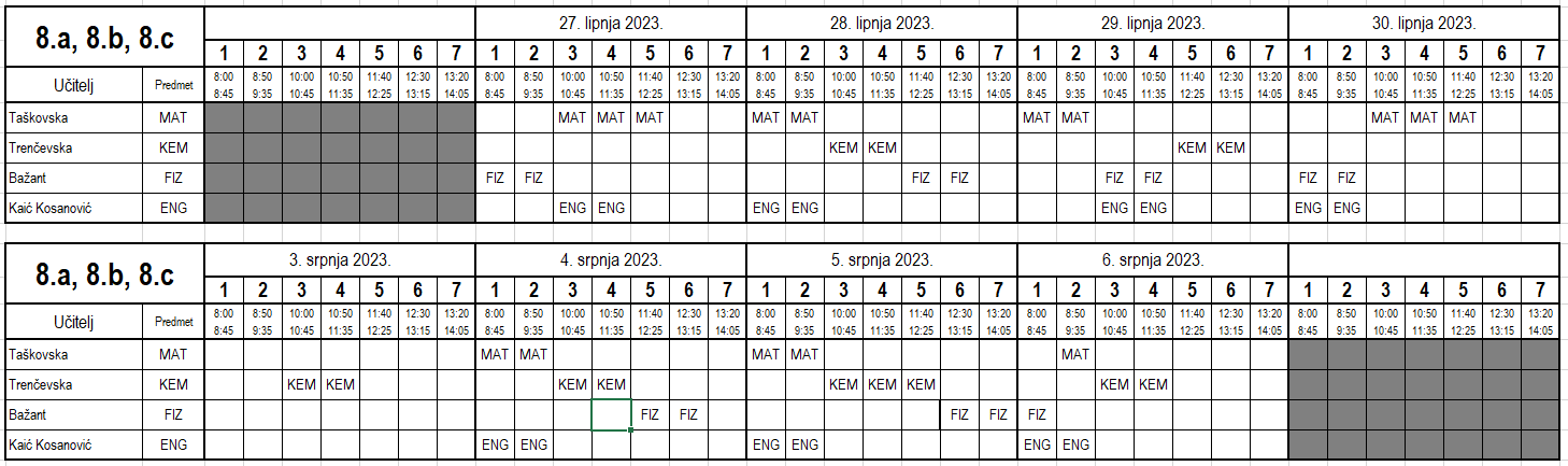 I ove godine neki učenici nisu uspjeli na vrijeme usvojiti predviđeno gradivo i za njih je organiziran dopunski rad od 27. 6. do 6. 7. 2023. Raspored je sljedeći (klikom na tablicu dobije se povećani prikaz):